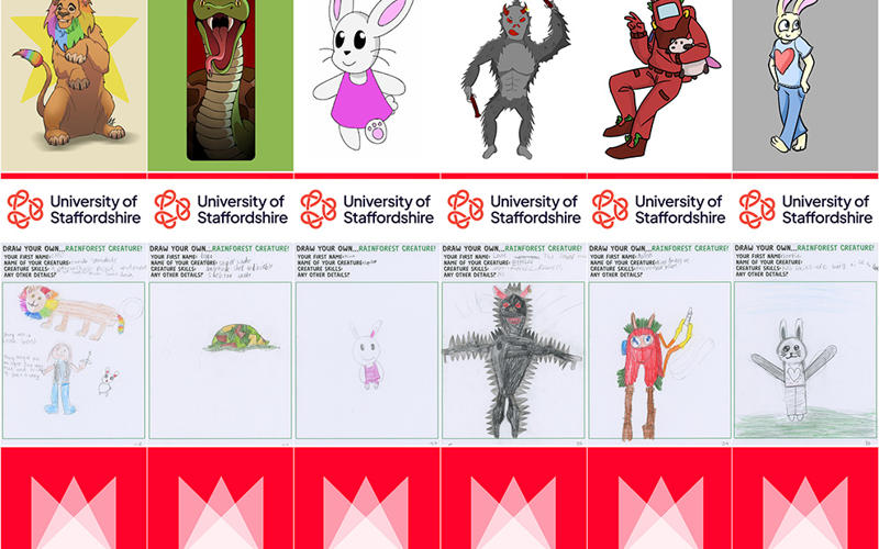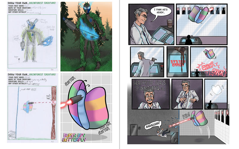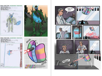 The children are always eager to help the students to develop exciting stories and characters, so each child draws a ‘rainforest creature’ for the students. The good thing about this age group is that their imagination isn’t hampered by physics or logic! As there’s around 60 children and 30 students in the workshop, each student is given two drawings to work with. The students are then tasked with drawing their version of the children’s characters and having those characters then go on a three page adventure.