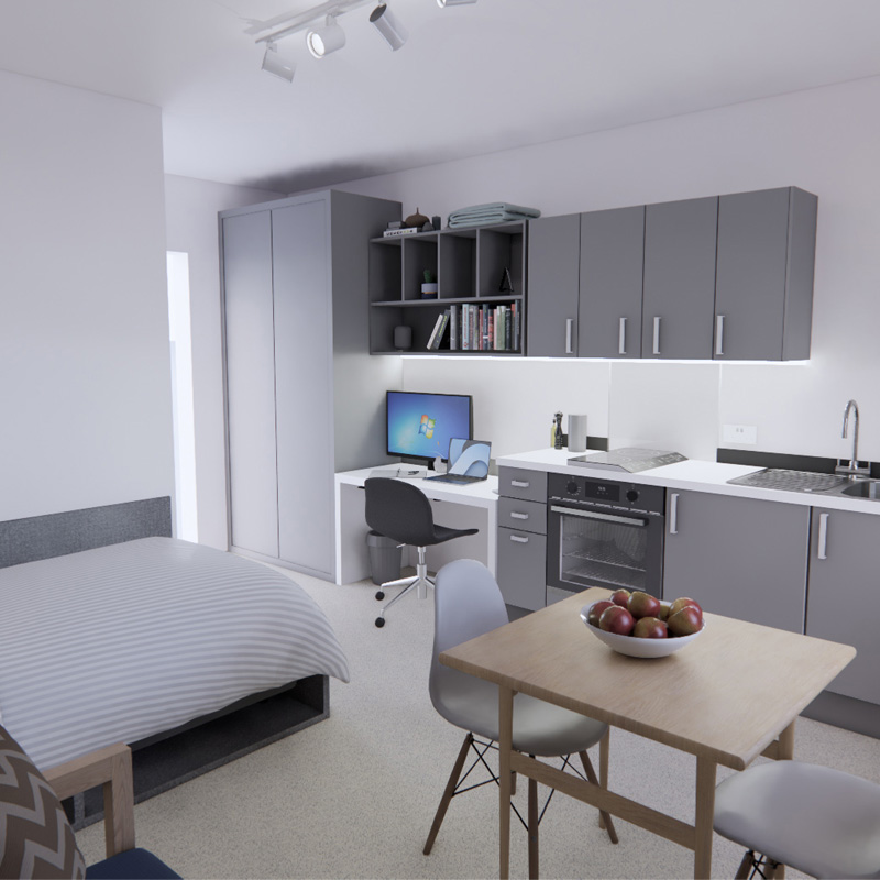 Gold Deluxe (Studio room) Home Student life Accommodation Our accommodation Gold Deluxe (Studio room) Coming in 2026 Our studios offer spacious, self-contained rooms complete with an ensuite bathroom, individual kitchenette and dining area. They’re ideal for students who want a little more privacy and the convenience of having everything within their own space. Plus, you’ll still have access to the shared spaces on the ground floor, so you won’t miss out on those all-important social moments and memories. £233/week £9,553 annually for minimum 42 weeks. Your duration can be extended if required. Bills included All included in the licence fee Self-contained studio With your own kitchenette, dining area and ensuite bathroom Imagery is indicative and not literal. Photos are artistic impressions. Studio room (artistic impression) Student Village (artistic impression) Student Village (artistic impression) Student Village (artistic impression) Student Village (artistic impression) Student Village (artistic impression) What's included? All university managed accommodation is within walking distance of the post room and launderette (pay as you use). Residents also have access to ResLife events, are in close proximity to our on-campus bars and cafes, plus get free membership to our on-campus sports centre. 24 hour security Including on site daytime police officer and SafeZone app Contents insured £10,000 Personal Contents Insurance (T&Cs apply) Free membership At our on campus gym and sports centre Your room Bedframe and mattress (small double) En-suite with shower, toilet, sink and mirror Desk Desk chair Drawers Wardrobe Shelving Pinboard Individual kitchenette individual-living-area Internet access via ASK4 (T&Cs apply) Shared spaces Lounge Dining area Communal laundry facilities What's NOT included TV licence - if you plan on watching live TV, or services that require a licence in your bedroom, it is your responsibility to purchase a TV licence. Location Gold Deluxe rooms are located in our new Student Village at the Leek Road site of our Stoke-on-Trent Campus. Set between our Nature Reserve, and the Nursery and Forest School, the Student Village is a five minute walk to the Leek Road site centre, and a 10 minute walk from College Road. You can also walk into Stoke town centre where you will find supermarkets, a weekly market, shops, bars and restaurants. Stoke-on-Trent Railway Station is also just an eight minute walk away. Disclaimer Rooms are subject to availability. The Student Village is currently under construction. The images shown in the advertising materials are artistic renderings of the room appearance and are for illustrative purposes only. In the unlikely event that your accommodation is not ready on time, you will still be allocated a room in alternative accommodation and will move to your first choice accommodation as soon as it is available. This room will be open for applications in 2026. View all accommodation