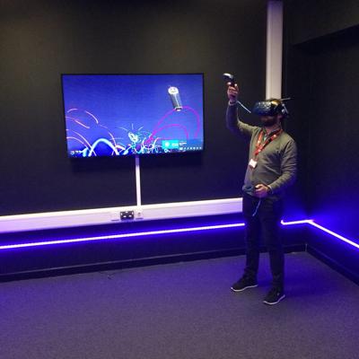 Home About Facilities Technical Immersive Technology Immersive Technology This collection of rooms and resources allows for exploration and development with Virtual and Augmented Reality technologies. The following three rooms, located on the first floor of Mellor, constitute the Immersive Technology portion of the Smart Zone: Mixed Reality Studio (S111) – Also known as the ‘green screen room’, S111 is a large room-scale VR space for use with a wireless VIVE Pro headset. The walls, floor, and ceiling are Chroma green to allow for the potential of mixed-reality recording, superimposing the user into their current VR experience. Dual VR Suite (S113) – Side-by-side VR spaces set up for VIVE Pro headsets with wireless attachments for full freedom at room-scale. XR Dev Lab (S115) – A 12-seat computer lab with VIVE hardware built-in for easy setup and rapid testing. Much of the supporting equipment, such as VR headsets and AR-capable phones, are available to book through Henrion Media Stores. More specialized equipment can be requested via our Technical staff and ranges from haptic feedback suits to holographic displays, all with support for various development environments such as Unity and Unreal Engine 4. Equipment TactSuit haptic vest, sleeves, and face cushion Manus VR haptic gloves Looking Glass 8.9” Looking Glass 15.6” VIVE Pro Eye VIVE Trackers Ultrahaptics TOUCH dev kit One of our dedicated VR pods in action The large Looking Glass The small looking glass A VIVE Tracker The Ultrahaptics TOUCH dev kit The Tactot Haptic Vest, Tactal haptic face cushion, and Tactosy pair of haptic sleeves Manus VR haptic gloves Staff Thomas Vine Technical Specialist Immersive Tech Email address: thomas.vine@staffs.ac.uk Location S111 S113 S115 Mellor Building College Road Stoke-on-Trent ST4 2DE Opening Times Monday to Friday 8am – 6pm Hub Smart Technology Hub for Career Prospects Whatuni Student Choice Awards 2025 for Social Inclusion The Times and Sunday Times Good University Guide 2026 for First Generation Students The Mail University Guide 2026 in the UK for Games Education Rookies Games Design and Development 2023, 2025 TIGA Best Games Institution 2024, 2025 of Research is “Internationally Excellent” or “World Leading” Research Excellence Framework 2021 of Research Impact is ‘Outstanding’ or ‘Very Considerable’ Research Excellence Framework 2021
