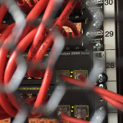 The Network labs are connected by a CAB room which contains 400+ industry standard network devices, mostly Cisco and Cisco Meraki switches, routers, firewalls, wireless LAN controllers and network traffic generators. These are housed in racks and constantly available for use by students. They can be wired to create a desired topology and configured from any machine in the lab.