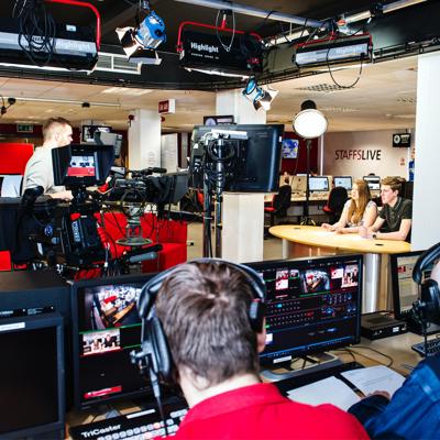 Professional three-camera television studio, complete with separate audio and visual gallery spaces. Studio floor includes tiered seating to accommodate an audience of 60 people.