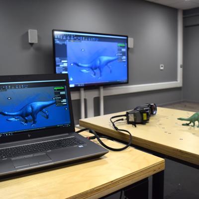 Home About Facilities Technical Visualisation and Simulation Studio Visualisation and Simulation Studio This multi-purpose space facilitates training, research and academic practice related to object digitisation, through the use of laser scanners and close range photogrammetry. The Smart Zone hosts a range of laser and structured light scanners. These enable students to create digital reconstructions of objects as small as a breadcrumb, to entire buildings. While dedicated instructional sessions for each of these scanners and the related software can be booked, our Technical Specialists are likewise available to perform scans for those purely interested in collecting data. View our Technical Instruction video library The Visualisation and Simulation Studio is an open plan space, exclusively available for object digitisation. Whether performed with any of our scanners or through the use of close range photogrammetry, the studio has been purpose built to provide ample space, privacy and flexibility to both students and researchers. Equipment HandySCAN Black Elite MechScan Macro 3D Scanner Faro FOCUS S70 Laser scan of a dinosaur model. Laser scanning a cardigan, demonstrating the power of the HandyScan Black Elite. Digitisation of a cardigan for use in 3D printing. Students get first hand experience with the HandyScan Black Elite. The HandySCAN Black Elite A subject that has been prepared for scanning Scanning in progress The raw data of a completed scan Video Location S116 Mellor Building College Road Stoke-on-Trent ST4 2DE Opening Times Monday to Friday 8am – 6pm, Saturday and Sunday 10am – 4pm, subject to training. Hub Smart Technology Hub